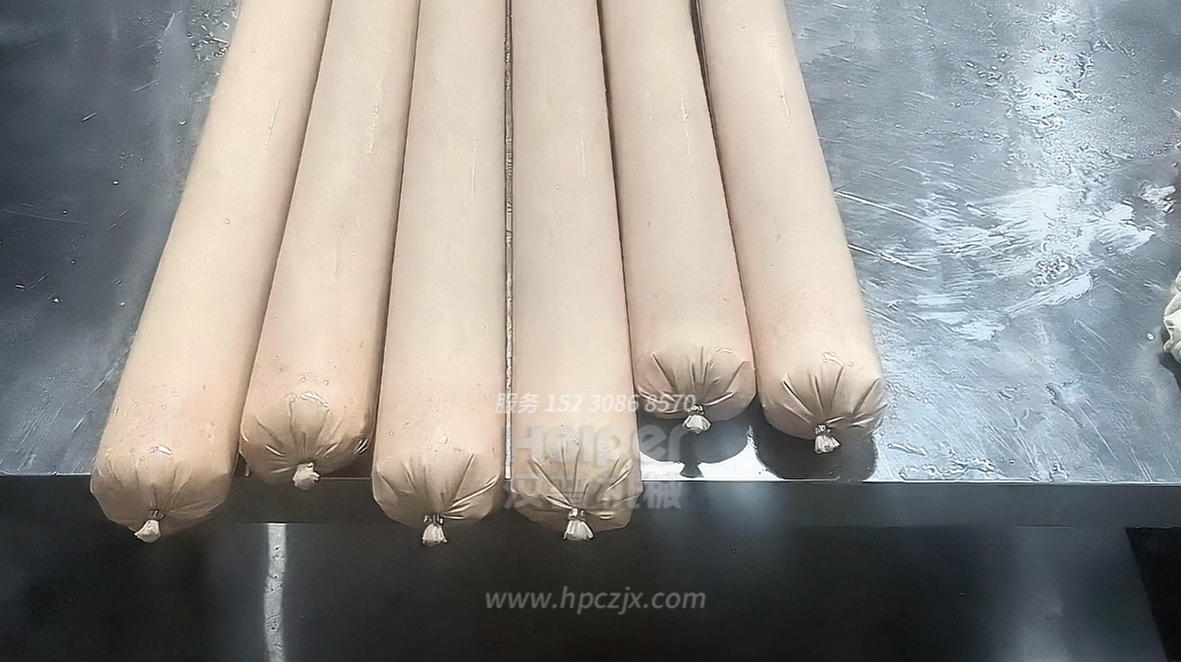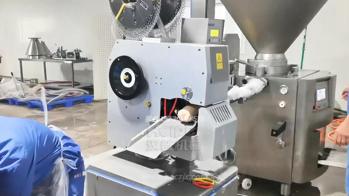 打卡封口: 灌裝后,設(shè)備會(huì)通過(guò)一個(gè)精密的打卡裝置,用鋁絲或U型卡釘在腸衣的兩端(或指定位置)進(jìn)行扭結(jié)、壓合,形成牢固的密封。這個(gè)過(guò)程會(huì)同步完成切斷,分離出獨(dú)立的香腸。