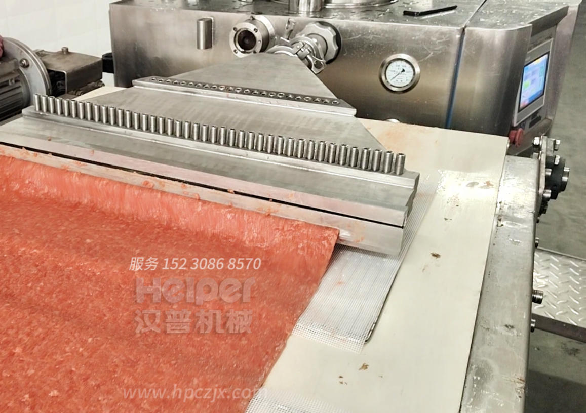 肉脯一般是片狀或條狀的固態(tài)肉干,調(diào)制攪拌好的肉餡通過真空灌裝機(jī)擠出到模具上完成灌裝過程,利用真空灌裝機(jī)可將肉餡物料中的空氣排走,使肉餡更加緊實(shí)無(wú)氣泡。